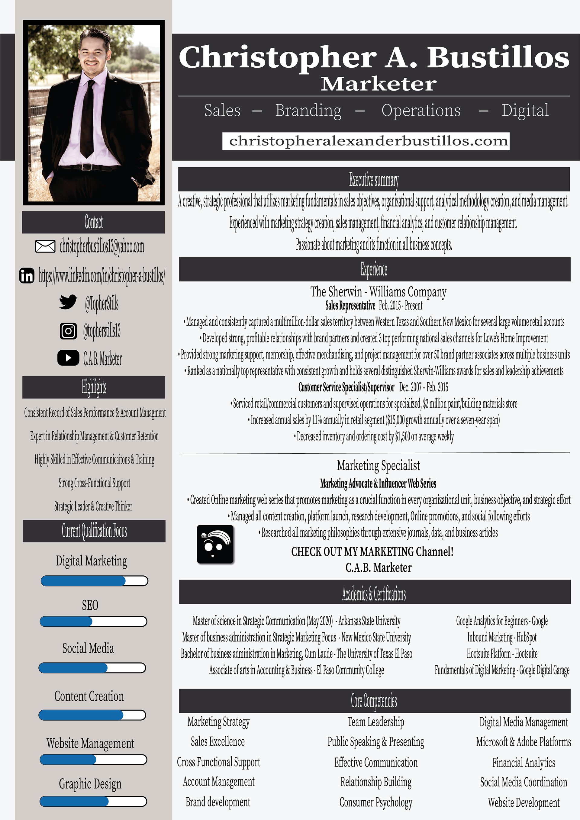 Hello! Here you can view some of the amazing thing I've done in my career, academics, and personal marketing endeavors! Click on my social links in the top banner to reach out to me. Thank you!